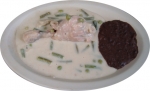 Pieza de Pollo (pierna o muslo) en salsa blanca con ejotes y chicharos.