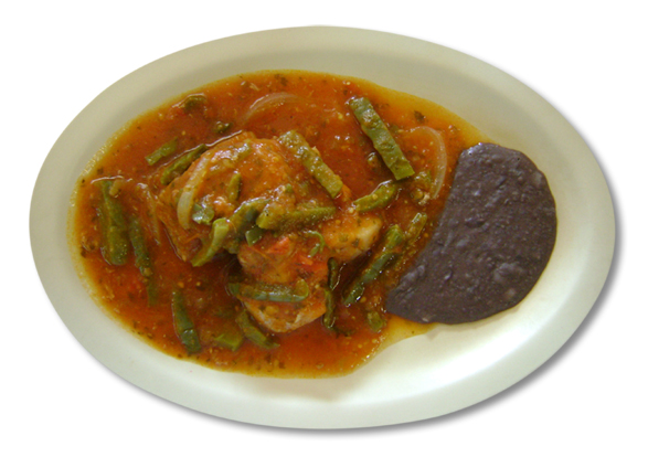 Pieza de pollo (pierna o muslo) en salsa a base almendras con trozos de Chilacayote.