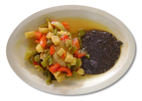 Pieza de Pollo (pierna y muslo) con Pimiento Morrón verde y rojo, apio y Trocitos de Piña en Salsa de Soya.